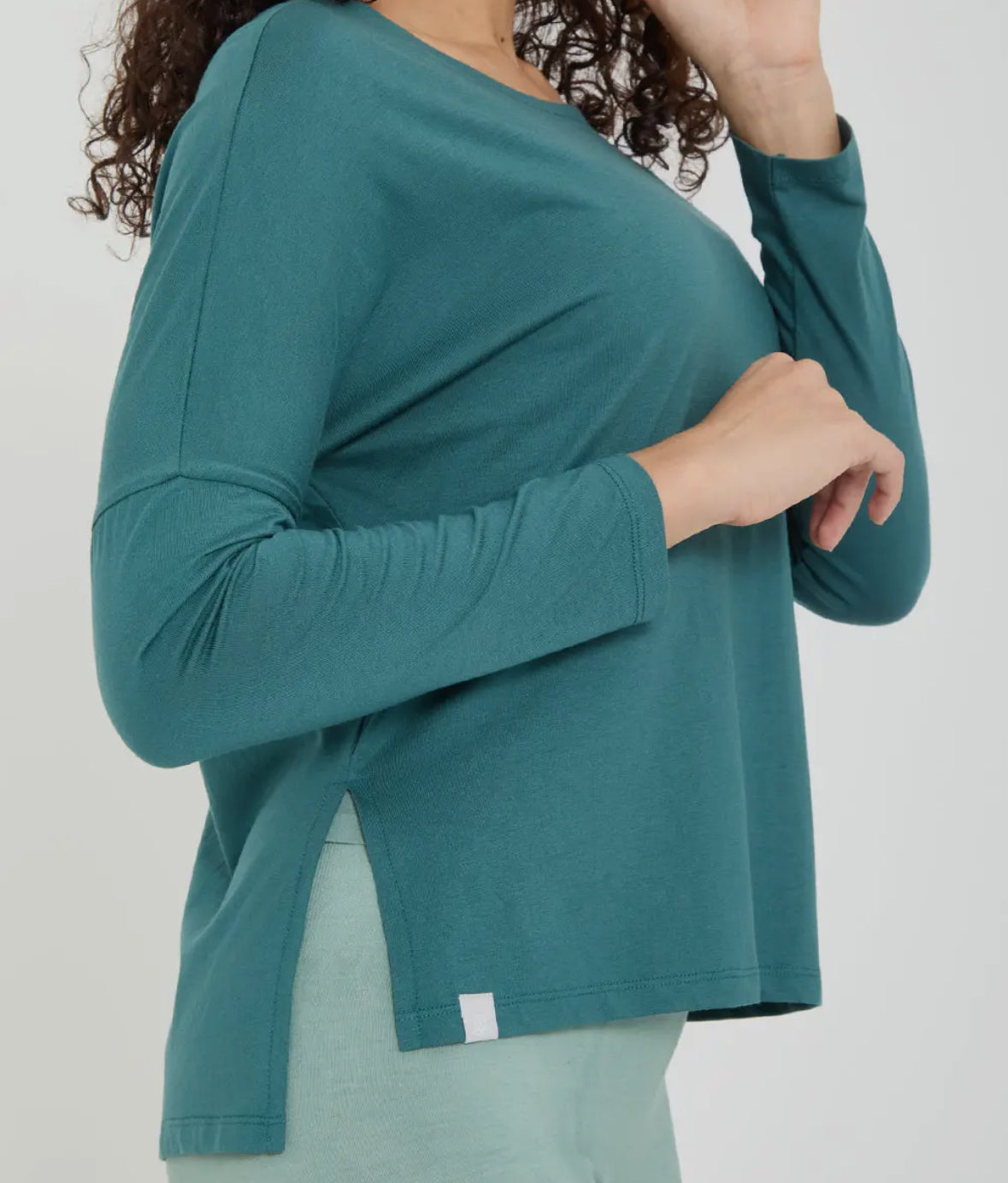 50% cotone, 50% modal, vestibilita’ larga, con spacchi laterali, leggermente più lunga dietro